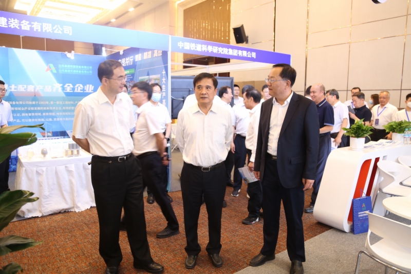 会议期间,黄民一行到集团展厅及会议现场展区参观交流,集团推出的山东铁路智能化建设管理平台、CRTSⅢ型板式无砟轨道智能施工技术与装备引得众人关注。山东铁路智能化建设管理平台是以数字技术赋能高铁智能化建设的重大成果,该平台包含从设计到施工再到运营阶段36个板块、390多个功能模块,实现了铁路建设全生命周期管理,形成了“一张图、数字化、智能化、可视化”的管理特色。平台已在济滨高铁项目全面推广应用,取得了良好成效,累计产生数据量70余万条,活跃用户8000多人。CRTSⅢ型板式无砟轨道智能施工技术与装备是指CRTSⅢ型板式无砟轨道“测量-调整-支护-灌注”一体化施工装备,并与配套施工工装之间无缝衔接,能够提高施工效率50%以上,减少人力1/3以上,实现施工全过程质量可控,并可拓展到其它类型无砟轨道施工中。