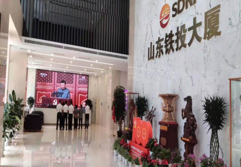 铁航物业公司员工在山东铁投大厦一楼大厅收看大会