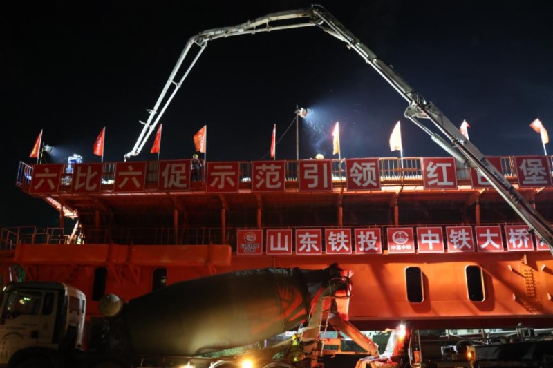 为确保此次浇筑顺利完成,济滨高铁公司坚持严要求、高标准施工,组织项目部合理配置资源,先后召开移动模架专项施工方案专家评审会、移动模架专项施工方案技术研讨会,为现场施工提供技术支撑。创新工艺工法,采用移动模架施工,机械化程度高、结构受力明确,实现了连续循环作业,满足技术、经济、结构和运行稳定性、施工方便性等各方面的要求。此外,单孔施工周期短、安全质量可控,既节省了劳动力、降低了劳动强度,还大大减少了对土地占用以及对生态环境的破坏。充分发挥济滨高铁党建联盟优势作用,党员先锋队、青年突击队精心组织、超前谋划,不断优化施工方案,多次开展专项培训和技术交底,有力彰显了党支部战斗堡垒和党员先锋模范作用。