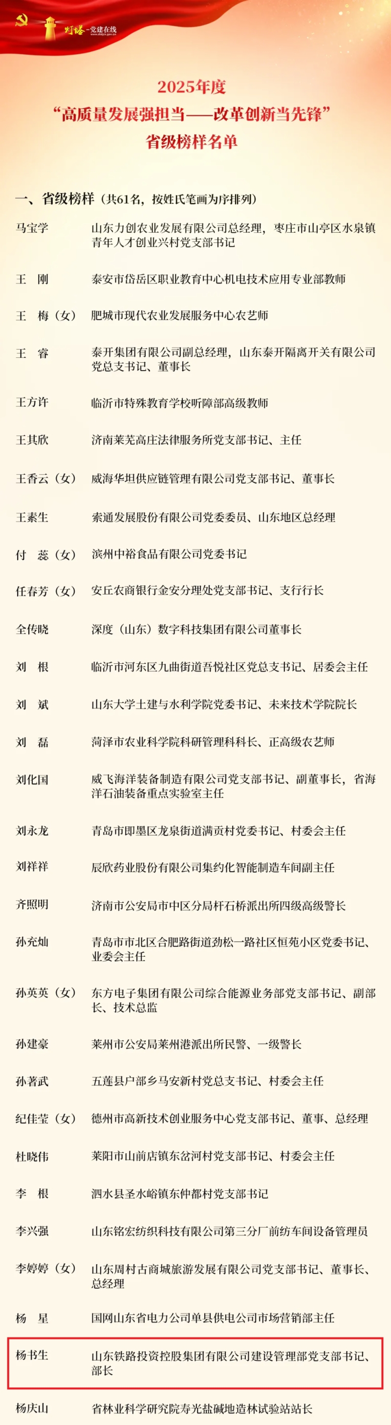 今年以来,按照省委关于抓改革创新促高质量发展的总体部署,省委组织部以“高质量发展强担当——改革创新当先锋”为主题,组织开展了2025年度“学习身边榜样”活动。经逐级举荐、严格把关,广泛征求意见,共确定省级榜样61名、省级榜样集体1个。