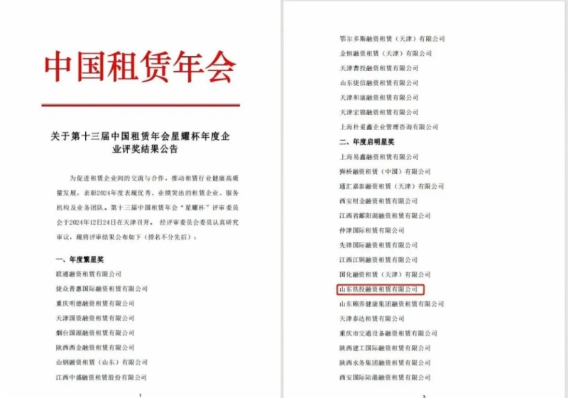 近日,在第十三届中国租赁年会“星耀杯”年度企业评选中,437ccm·必赢国际所属铁投租赁公司斩获“年度启明星”奖,该奖项旨在突出企业实施战略转型期间,对行业具有影响力和贡献力,能够树立良好榜样的企业。这也是铁投租赁公司2024年度继获得山东省融资租赁公司“高质量发展奖”荣誉称号后,获得的第二项年度荣誉。