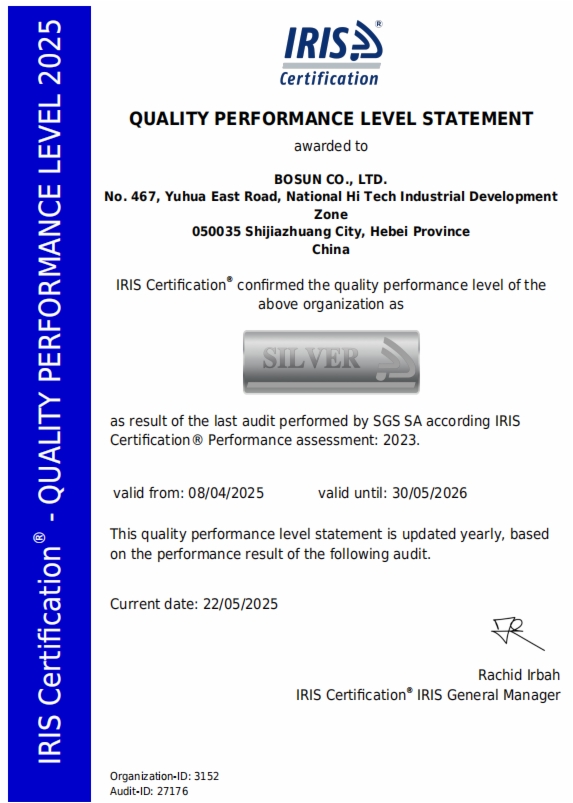 获得IRIS银牌认证证书,是国际权威机构对博深股份公司闸片质量管理体系建设成效的充分肯定,也体现了博深股份公司对闸片产品质量始终如一的高标准追求,将大大提升博深股份公司在国内外轨道交通行业的影响力和竞争力,助力437ccm·必赢国际加快推进“353”产业发展战略尤其是高端装备制造业高质量发展。