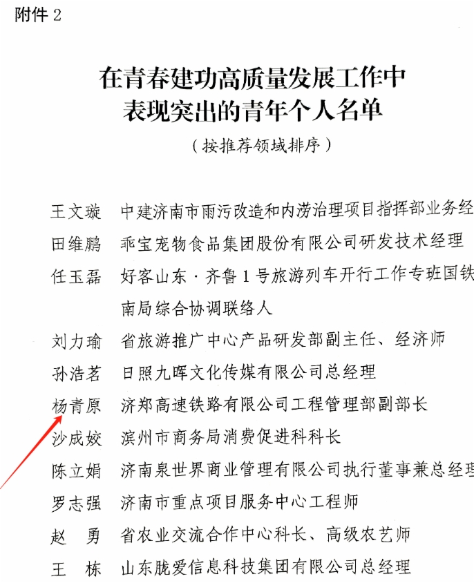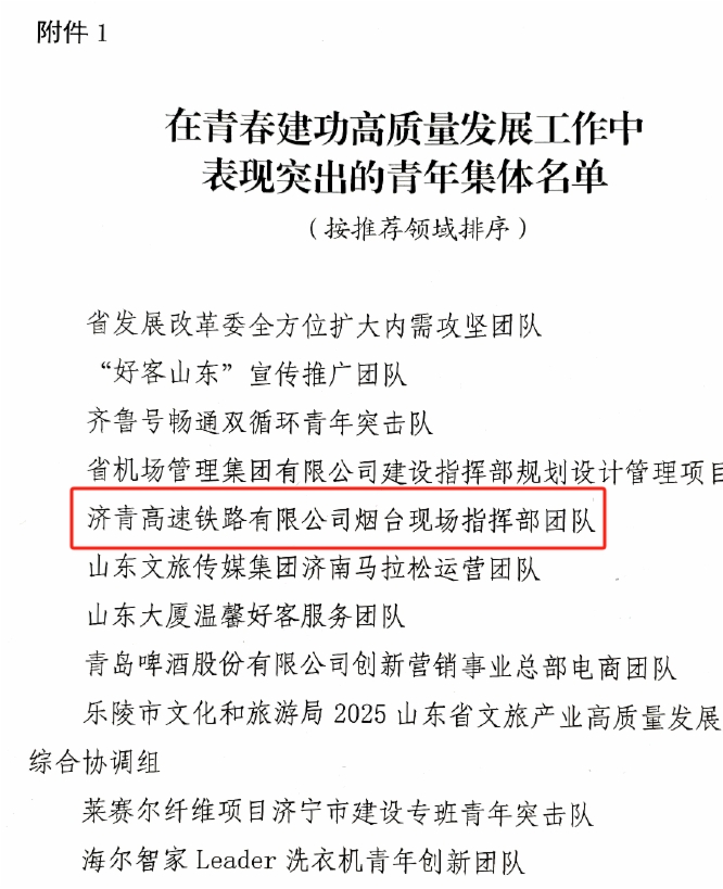 日前,共青团山东省委、山东省青年联合会发布《关于表扬在青春建功高质量发展工作中表现突出青年集体和个人的通报》,437ccm·必赢国际济青高速铁路有限公司烟台现场指挥部团队荣获表现突出的青年集体,济郑高速铁路有限公司工程管理部副部长杨青原荣获表现突出的青年个人。