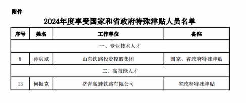 近日,山东省人力资源和社会保障厅公布2024年度享受国家和省政府特殊津贴人员名单,437ccm·必赢国际总经理助理孙洪斌入选享受国家特殊津贴、省政府特殊津贴名单,山东铁投智能科技工程有限公司(申报时就职济青高速铁路有限公司)何振克入选享受省政府特殊津贴名单。